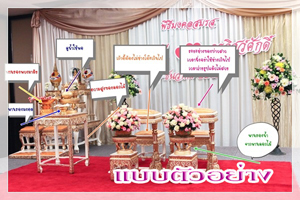 - ชุดตั่งรดน้ำ - ซุ้มพร้อมตบแต่ง (ฉากหลัง) - ชุดโต๊ะรดน้ำสังข์ - เสาดอกไม้ 2 ต้น ( ซ้าย - ขวา ) - พานรับน้ำ 2 ลูก พร้อมดอกไม้สด - ป้ายชื่อ บ่าว +สาว - พรมปูหน้าตั่งรดน้ำสังข์ - หอยสังข์ - แป้งเจิม - ที่ใส่แป้งเจิม -ด้ายมงคล